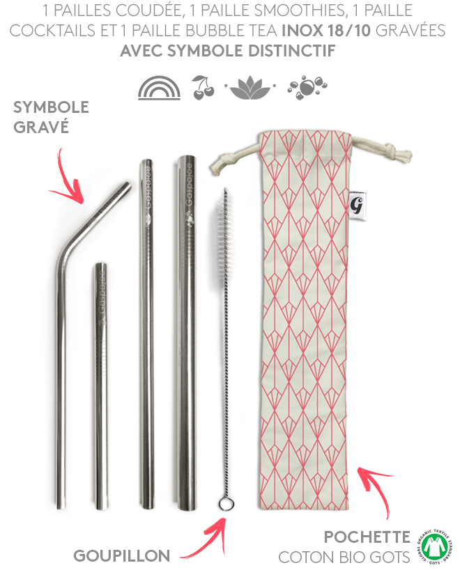 Le petit plus malin Gaspajoe : de petits symboles distinctifs et évocateurs sont gravés sur chaque paille. Et chacun retrouve la sienne !